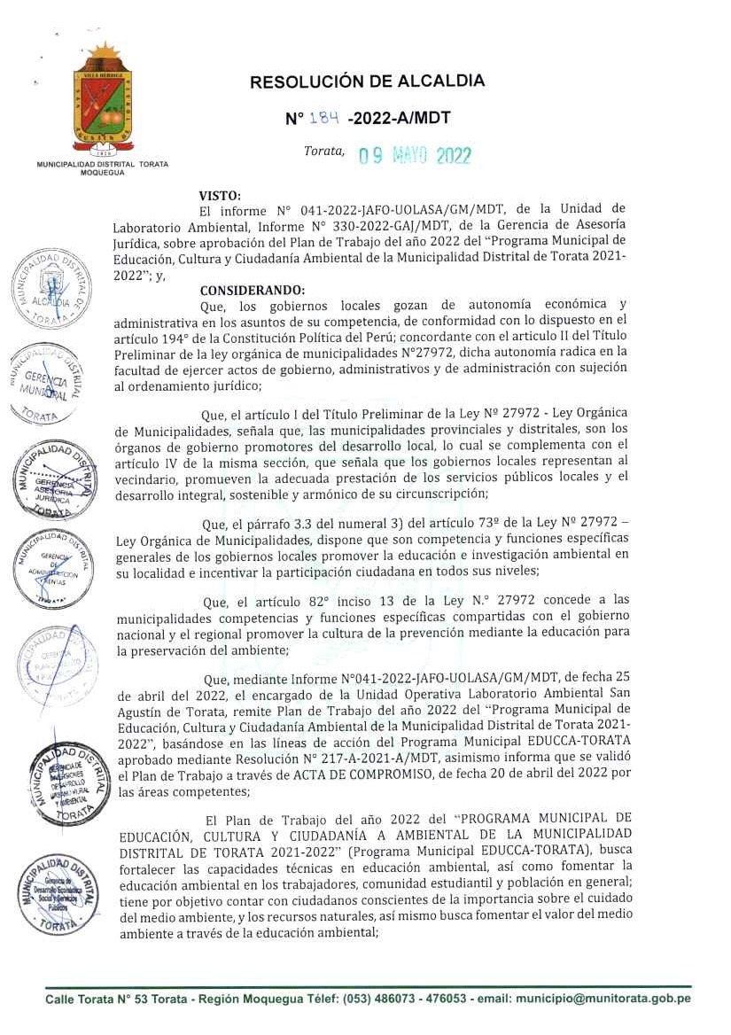 La presente Resolución aprueba el Plan de Trabajo 2022 del Programa Municipal de Educación, Cultura y Ciudadanía Ambiental de la Municipalidad Distrital de Torata, Mariscal Nieto, con la finalidad de definir las actividades de educación, cultura y ciudadanía ambiental que se desarrollarán en la localidad durante el presente año.