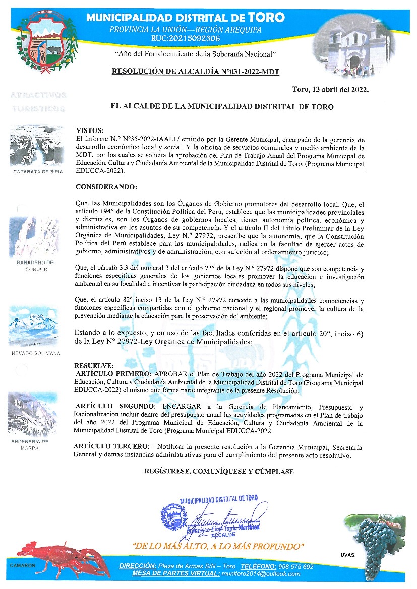 Plan de Trabajo 2022 del Programa Municipal EDUCCA - Toro