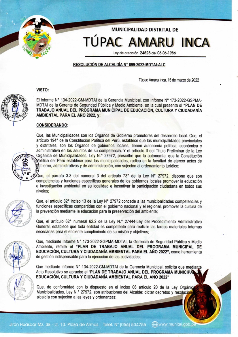La presente Resolución aprueba el Plan de Trabajo 2022 del Programa Municipal de Educación, Cultura y Ciudadanía Ambiental de la Municipalidad Distrital de Túpac Amaru Inca - Pisco, con la finalidad de definir las actividades de educación, cultura y ciudadanía ambiental que se desarrollarán en la localidad durante el presente año