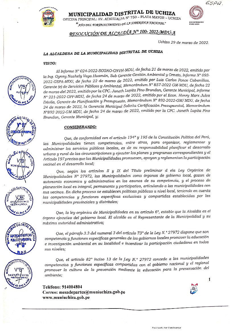 La presente Resolución aprueba el Plan de Trabajo 2022 del Programa Municipal de Educación, Cultura y Ciudadanía Ambiental de la Municipalidad Distrital de Uchiza, con la finalidad de definir las actividades de educación, cultura y ciudadanía ambiental que se desarrollarán en la localidad durante el presente año.