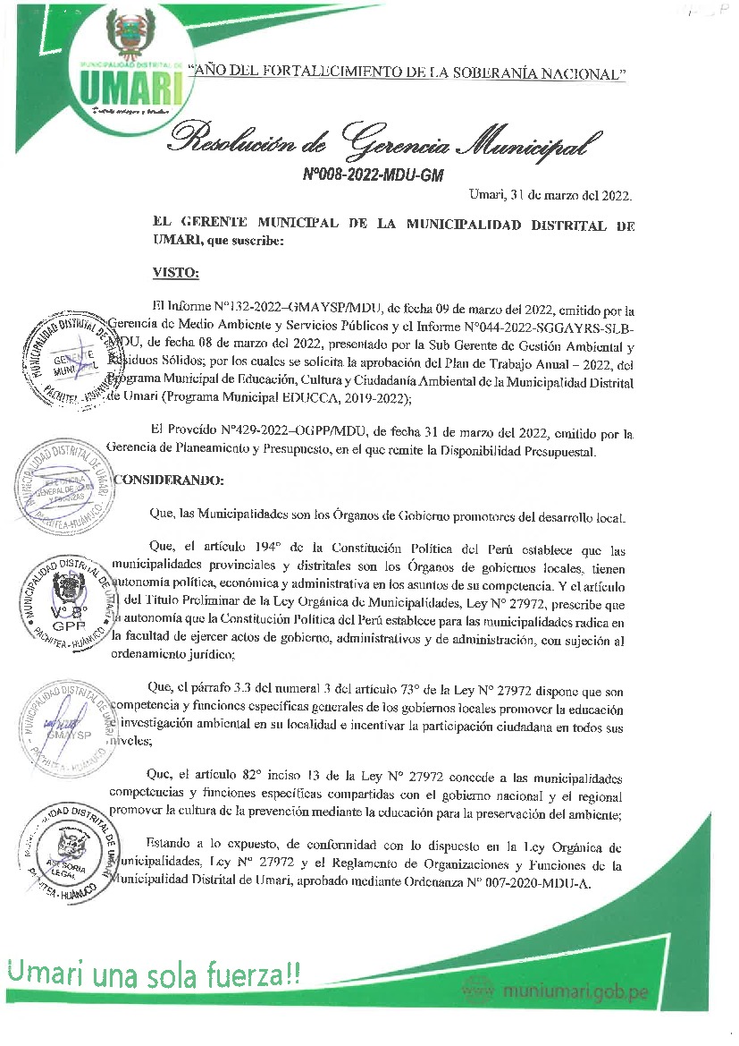 La presente Resolución aprueba el Plan de Trabajo 2022 del Programa Municipal de Educación, Cultura y Ciudadanía Ambiental de la Municipalidad Distrital de Umari, con la finalidad de definir las actividades de educación, cultura y ciudadanía ambiental que se desarrollarán en la localidad durante el presente año.