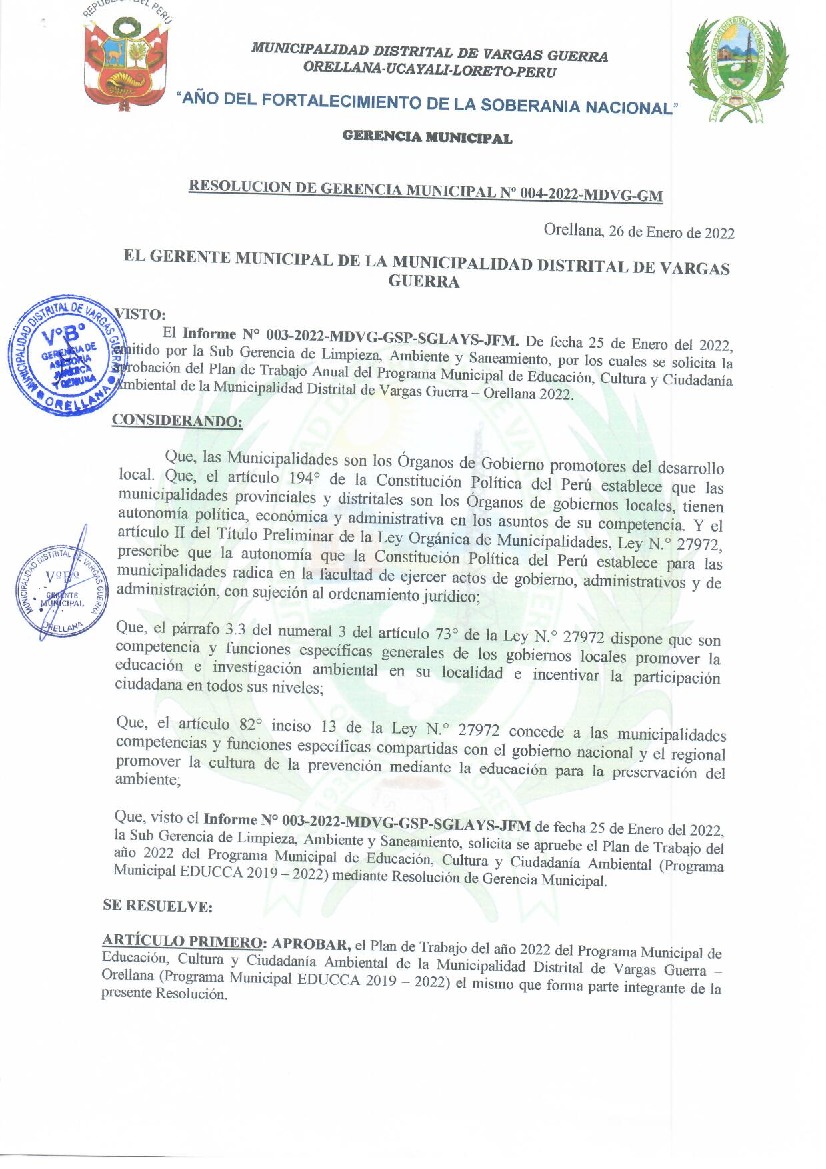 La presente Resolución aprueba el Plan de Trabajo 2022 del Programa Municipal de Educación, Cultura y Ciudadanía Ambiental de la Municipalidad Distrital de Vargas Guerra, con la finalidad de definir las actividades de educación, cultura y ciudadanía ambiental que se desarrollarán en la localidad durante el presente año.