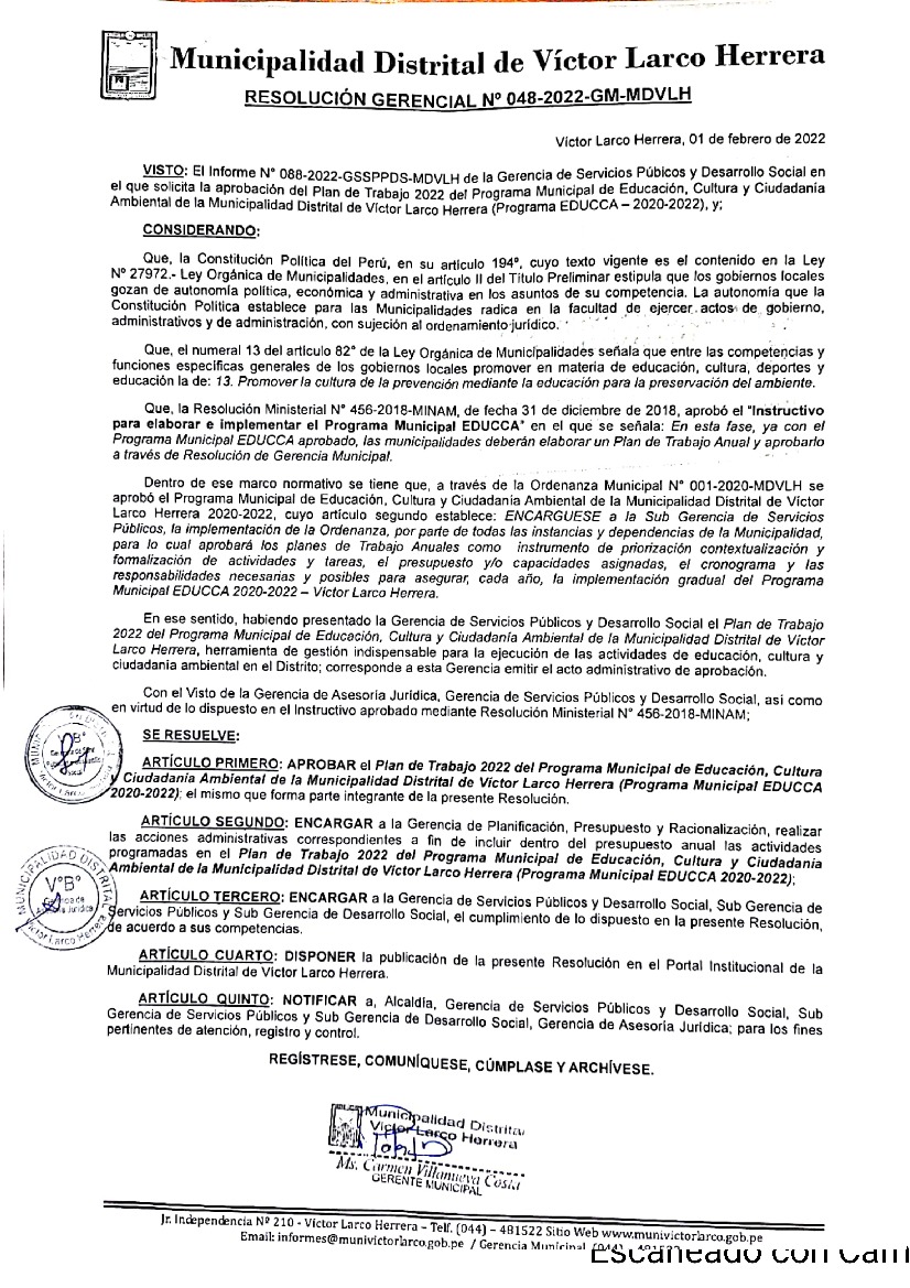 La presente Resolución aprueba el Plan de Trabajo 2022 del Programa Municipal de Educación, Cultura y Ciudadanía Ambiental de la Municipalidad Distrital de Víctor Larco Herrera, con la finalidad de definir las actividades de educación, cultura y ciudadanía ambiental que se desarrollarán en la localidad durante el presente año.