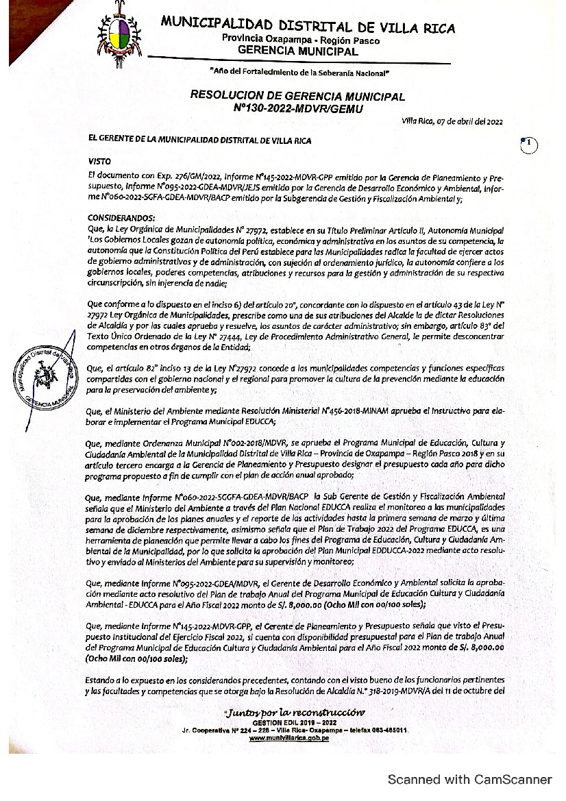 La presente Resolución aprueba el Plan de Trabajo 2022 del Programa Municipal de Educación, Cultura y Ciudadanía Ambiental de la Municipalidad Distrital de Villa Rica, con la finalidad de definir las actividades de educación, cultura y ciudadanía ambiental que se desarrollarán en la localidad durante el presente año.