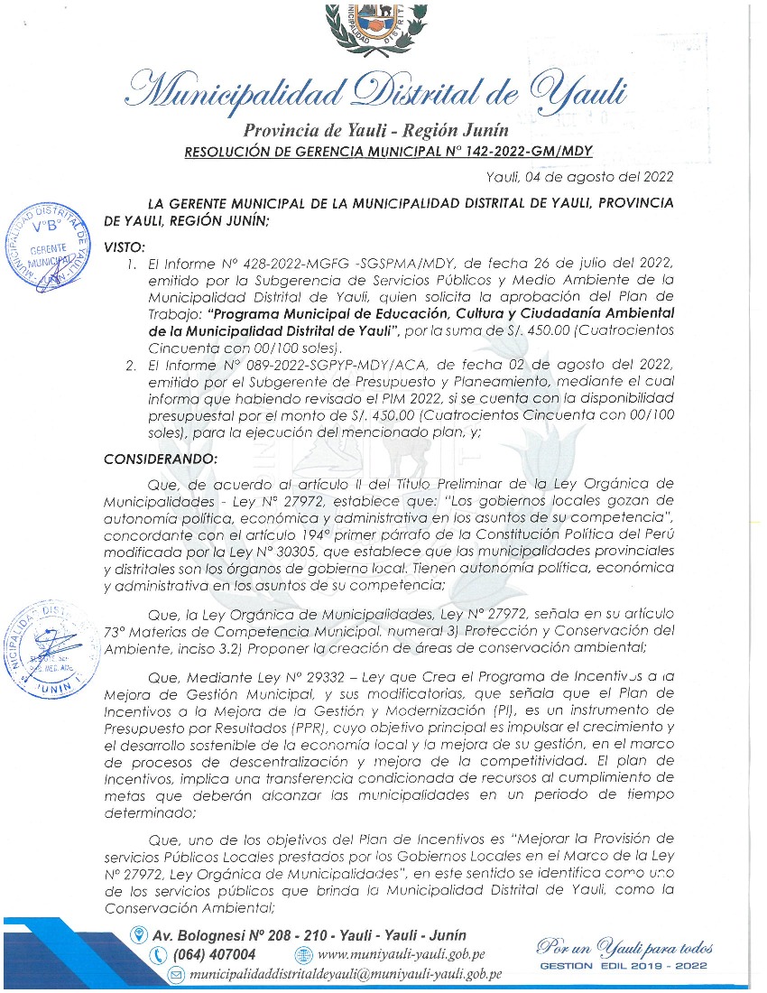 La presente Resolución aprueba el Plan de Trabajo 2022 del Programa Municipal de Educación, Cultura y Ciudadanía Ambiental de la Municipalidad Distrital de Yauli, con la finalidad de definir las actividades de educación, cultura y ciudadanía ambiental que se desarrollarán en la localidad durante el presente año.