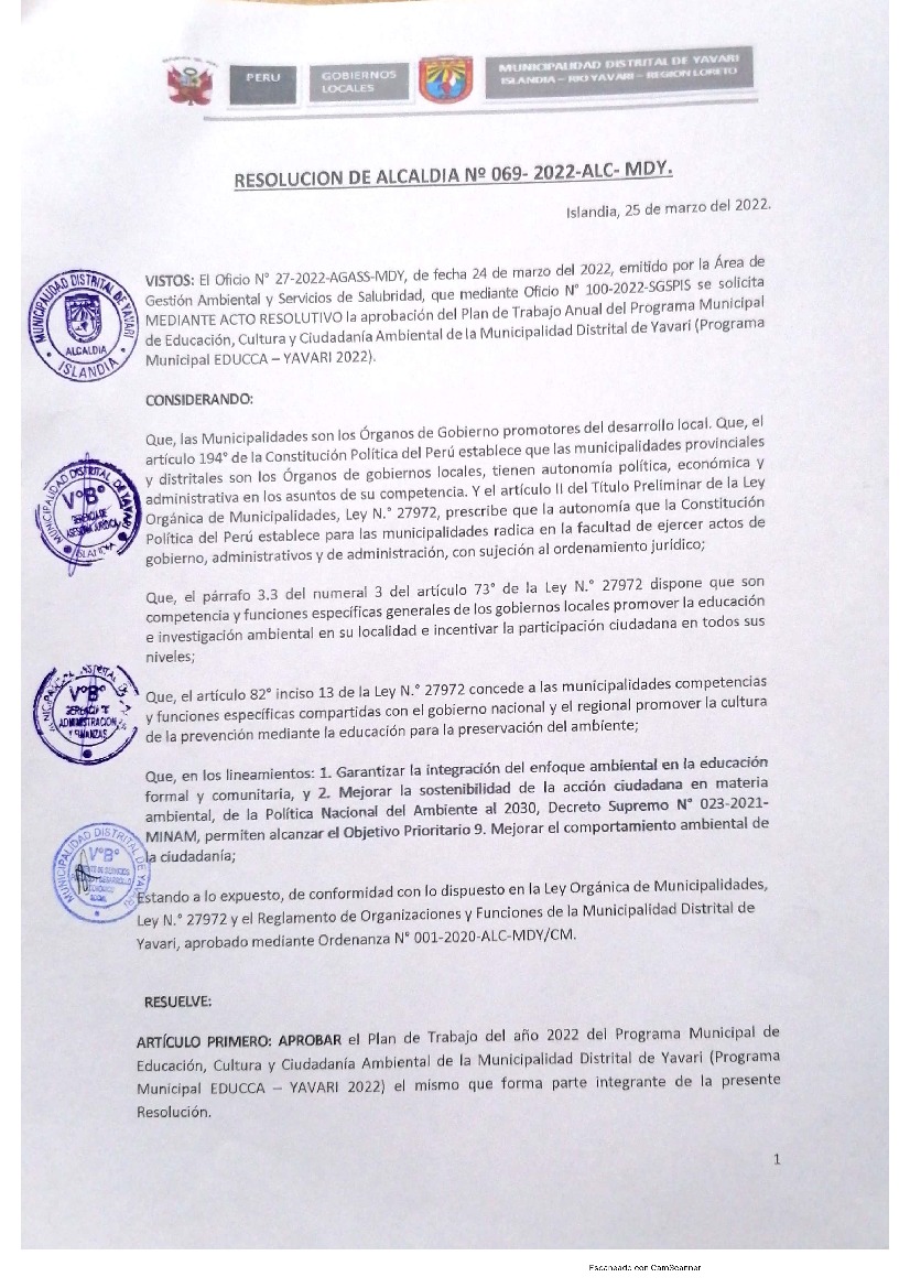 La presente Resolución aprueba el Plan de Trabajo 2022 del Programa Municipal de Educación, Cultura y Ciudadanía Ambiental de la Municipalidad Distrital de Yavarí, con la finalidad de definir las actividades de educación, cultura y ciudadanía ambiental que se desarrollarán en la localidad durante el presente año.