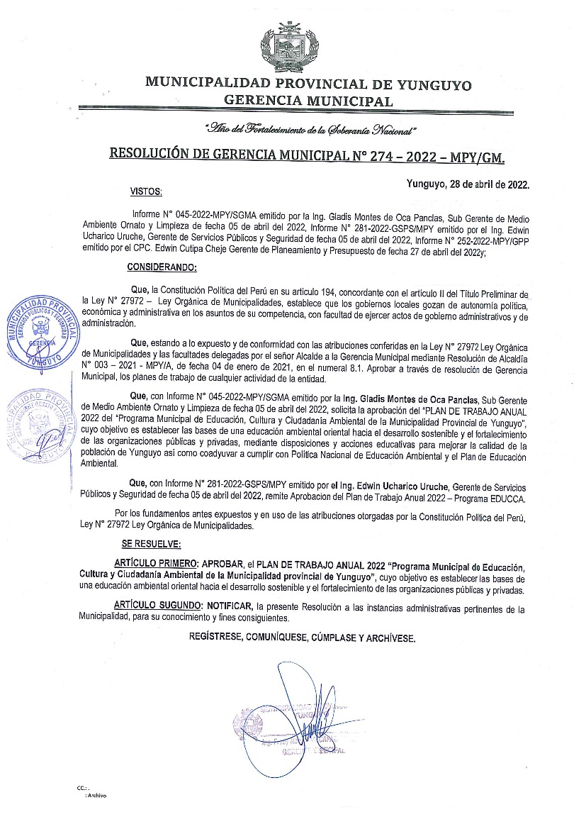 La presente Resolución aprueba el Plan de Trabajo 2022 del Programa Municipal de Educación, Cultura y Ciudadanía Ambiental de la Municipalidad Provincial de Yunguyo, con la finalidad de definir las actividades de educación, cultura y ciudadanía ambiental que se desarrollarán en la localidad durante el presente año.
