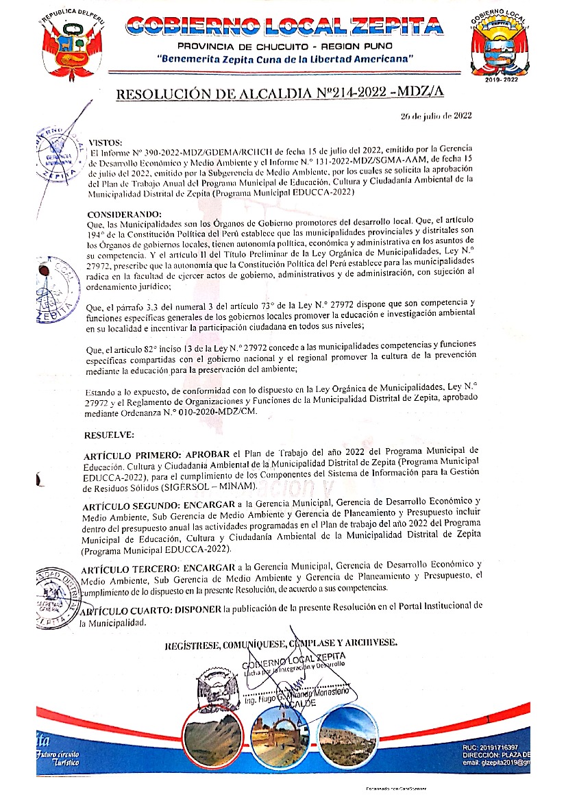La presente Resolución aprueba el Plan de Trabajo 2022 del Programa Municipal de Educación, Cultura y Ciudadanía Ambiental de la Municipalidad Distrital de Zepita, con la finalidad de definir las actividades de educación, cultura y ciudadanía ambiental que se desarrollarán en la localidad durante el presente año.