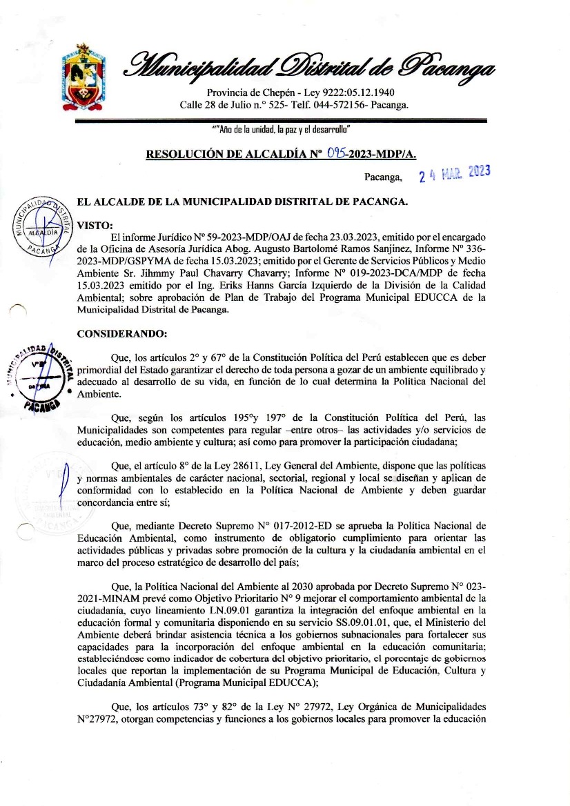 La presente Resolución de Alcaldía aprueba el Plan de Trabajo 2023 del Programa Municipal de Educación, Cultura y Ciudadanía Ambiental de la Municipalidad Distrital de Pacanga - Chepen (La Libertad), con la finalidad de definir las actividades de educación, cultura y ciudadanía ambiental que se desarrollarán en la localidad durante el presente año.