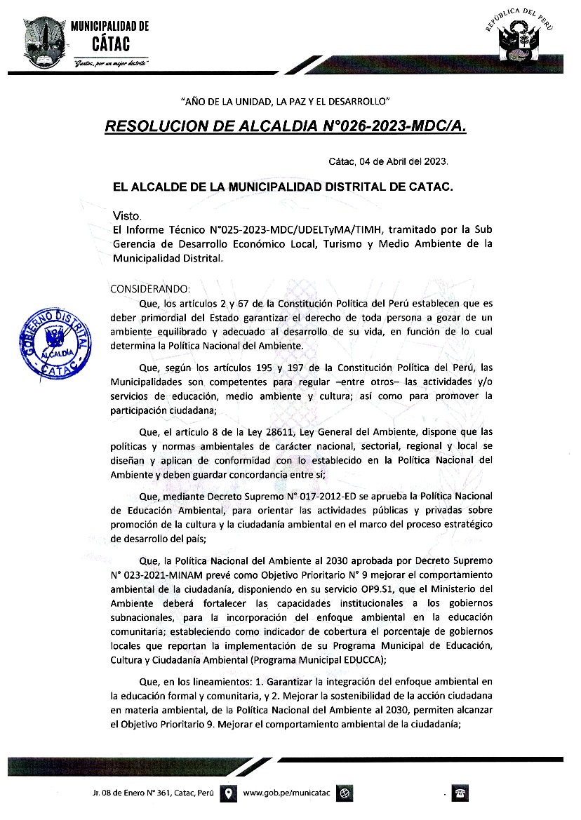 La presente Resolución de Alcaldía aprueba el Plan de Trabajo 2023 del Programa Municipal de Educación, Cultura y Ciudadanía Ambiental de la Municipalidad Distrital de Catac - Recuay (Ancash), con la finalidad de definir las actividades de educación, cultura y ciudadanía ambiental que se desarrollarán en la localidad durante el presente año.