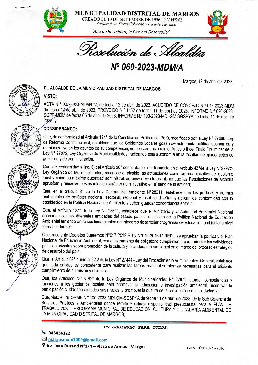 La presente Resolución de Alcaldía aprueba el Plan de Trabajo 2023 del Programa Municipal de Educación, Cultura y Ciudadanía Ambiental de la Municipalidad Distrital de Margos - Huánuco (Huánuco), con la finalidad de definir las actividades de educación, cultura y ciudadanía ambiental que se desarrollarán en la localidad durante el presente año.