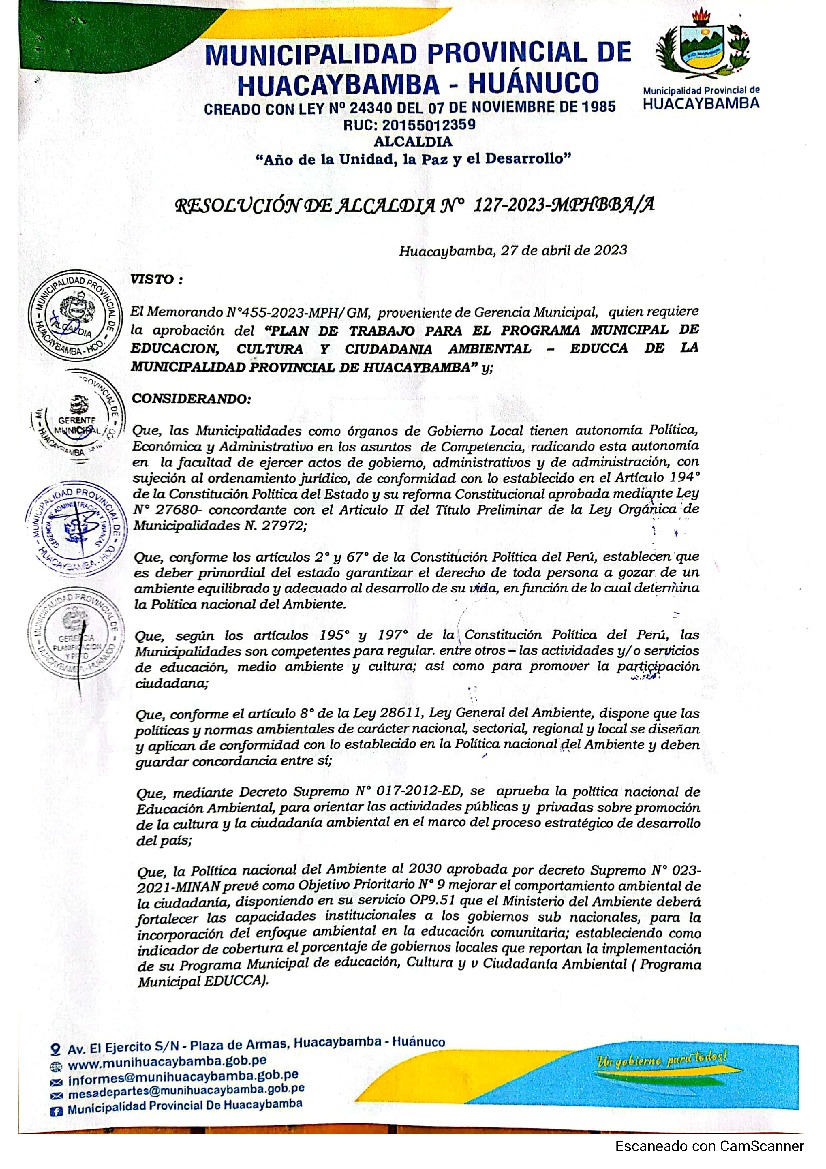 La presente Resolución de Alcaldía aprueba el Plan de Trabajo 2023 del Programa Municipal de Educación, Cultura y Ciudadanía Ambiental de la Municipalidad Provincial de Huacaybamba (Huánuco), con la finalidad de definir las actividades de educación, cultura y ciudadanía ambiental que se desarrollarán en la localidad durante el presente año.
