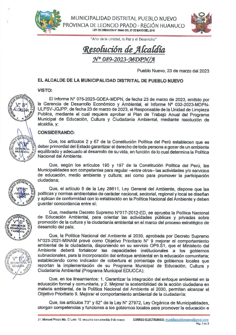 La presente Resolución de Alcaldía aprueba el Plan de Trabajo 2023 del Programa Municipal de Educación, Cultura y Ciudadanía Ambiental de la Municipalidad Distrital de Pueblo Nuevo - Leoncio Prado (Huánuco), con la finalidad de definir las actividades de educación, cultura y ciudadanía ambiental que se desarrollarán en la localidad durante el presente año.