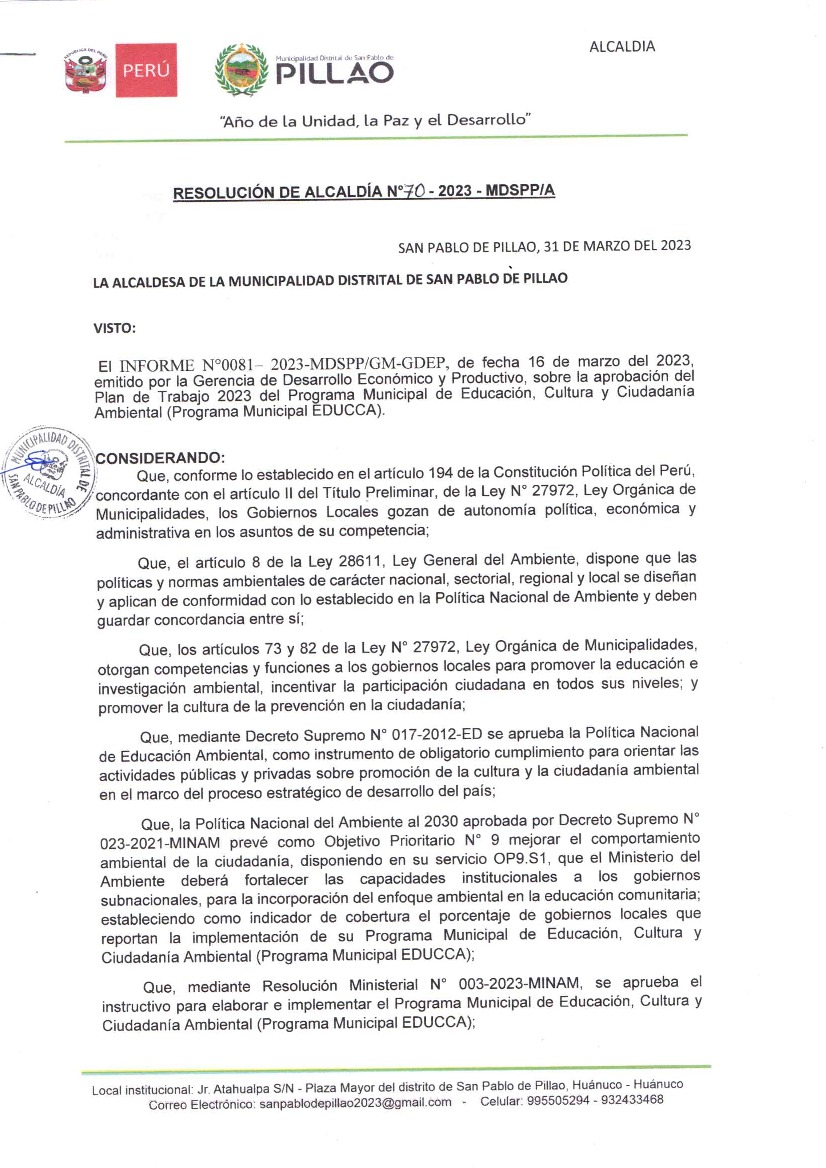 La presente Resolución de Alcaldía aprueba el Plan de Trabajo 2023 del Programa Municipal de Educación, Cultura y Ciudadanía Ambiental de la Municipalidad Distrital de San Pablo de Pillao - Huánuco (Huánuco), con la finalidad de definir las actividades de educación, cultura y ciudadanía ambiental que se desarrollarán en la localidad durante el presente año.