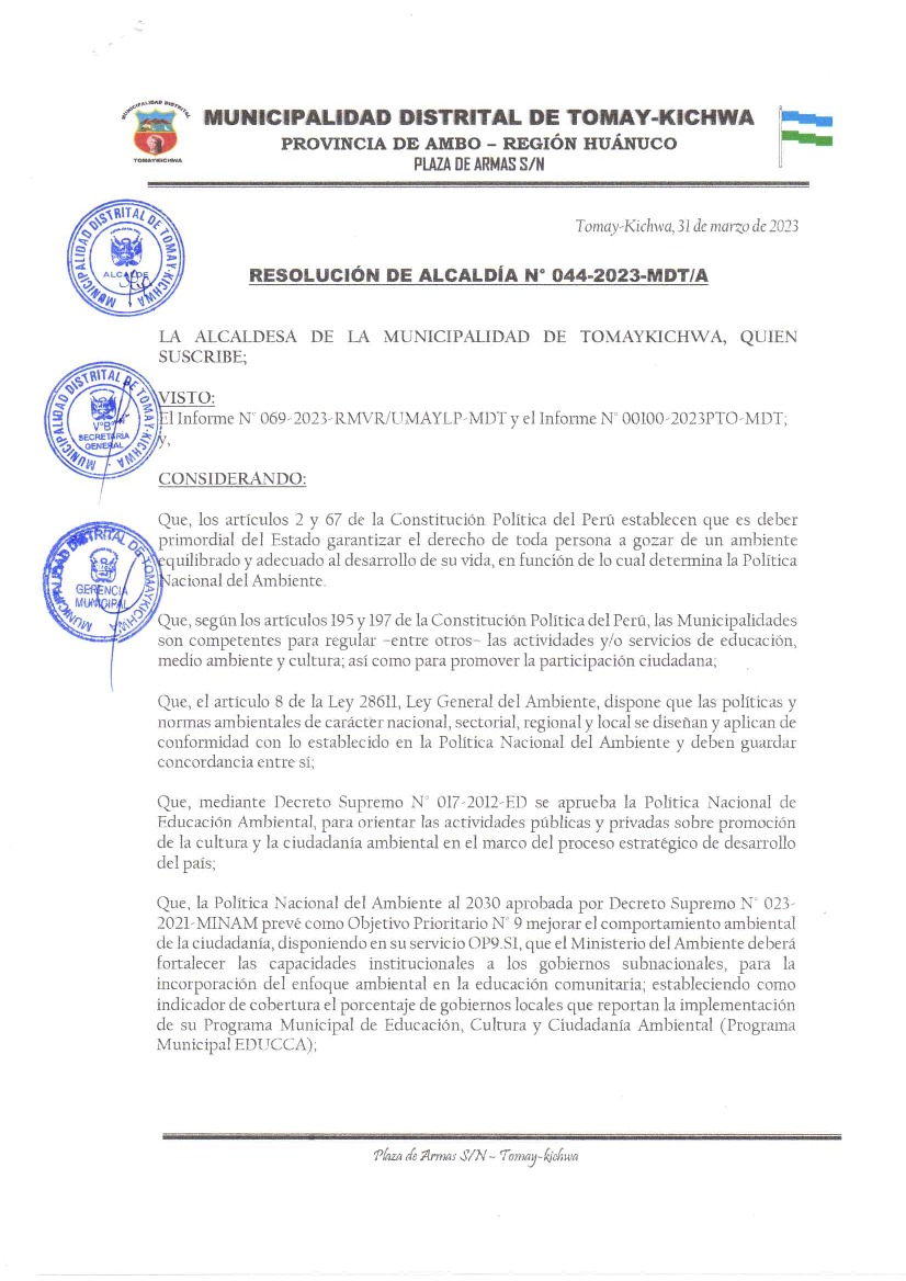 La presente Resolución de Alcaldía aprueba el Plan de Trabajo 2023 del Programa Municipal de Educación, Cultura y Ciudadanía Ambiental de la Municipalidad Distrital de Tomay Kichwa - Ambo (Huánuco), con la finalidad de definir las actividades de educación, cultura y ciudadanía ambiental que se desarrollarán en la localidad durante el presente año.
