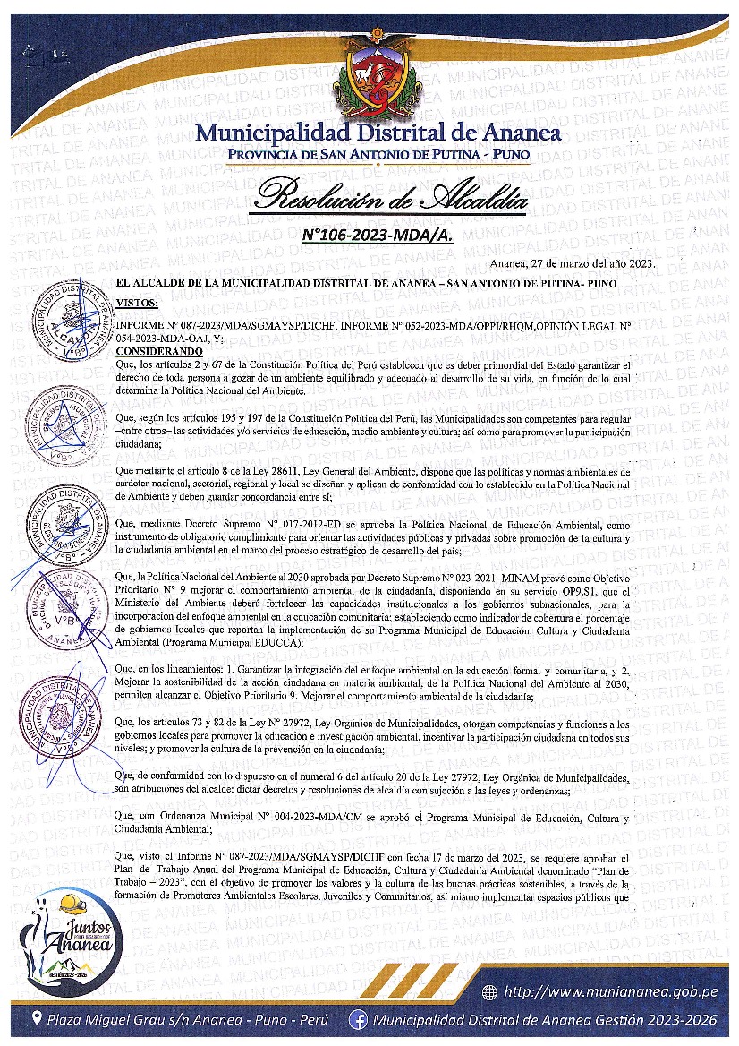 La presente Resolución aprueba el Plan de Trabajo 2023 del Programa Municipal de Educación, Cultura y Ciudadanía Ambiental de la Municipalidad Distrital de Ananea, con la finalidad de definir las actividades de educación, cultura y ciudadanía ambiental que se desarrollarán en la localidad durante el presente año.