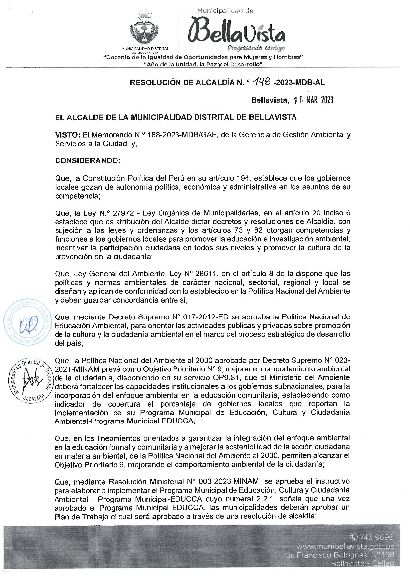 La presente Resolución de Alcaldía, aprueba el Plan de Trabajo 2023 del Programa Municipal de Educación, Cultura y Ciudadanía Ambiental de la Municipalidad Distrital de Bellavista (Callao), con la finalidad de definir las actividades de educación, cultura y ciudadanía ambiental que se desarrollarán en la localidad durante el presente año.
