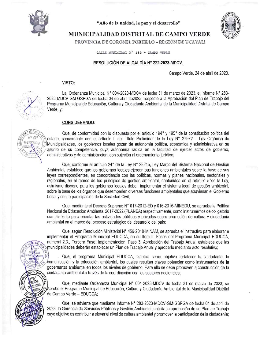 La presente Resolución de Alcaldía aprueba el Plan de Trabajo 2023 del Programa Municipal de Educación, Cultura y Ciudadanía Ambiental de la Municipalidad Distrital de Campoverde, provincia de Cornoel Portillo, región Ucayali, con la finalidad de definir las actividades de educación, cultura y ciudadanía ambiental que se desarrollarán en la localidad durante el presente año.