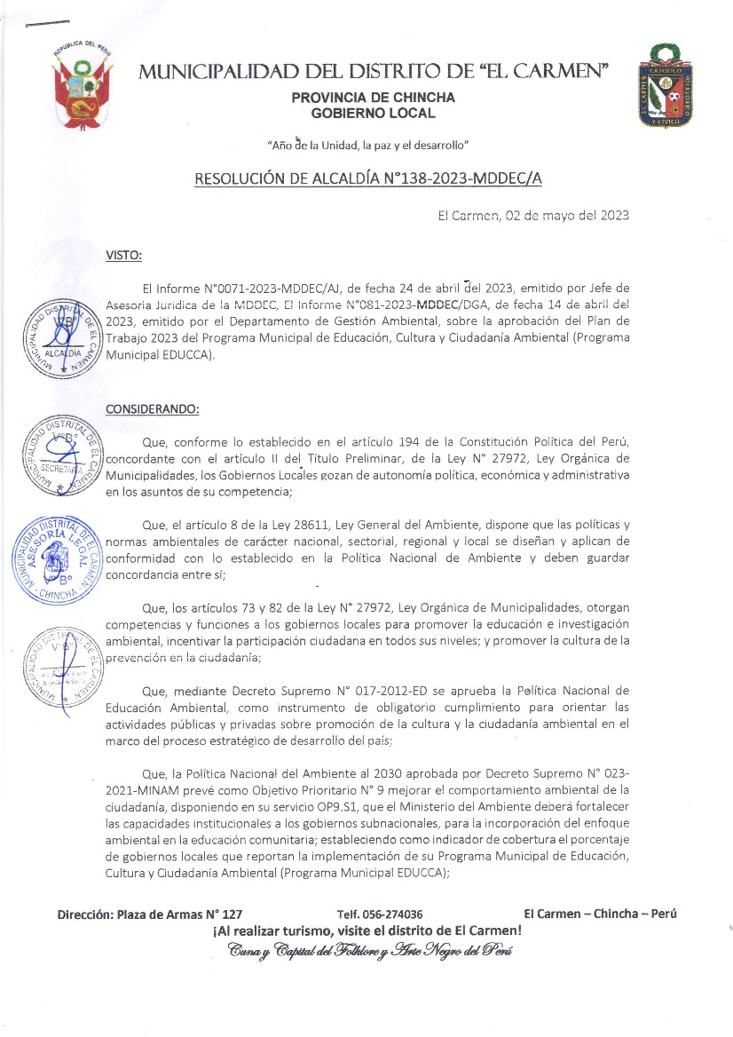 La presente Resolución de Alcaldía aprueba el Plan de Trabajo 2023 del Programa Municipal de Educación, Cultura y Ciudadanía Ambiental de la Municipalidad Distrital de El Carmen - Chincha (Ica), con la finalidad de definir las actividades de educación, cultura y ciudadanía ambiental que se desarrollarán en la localidad durante el presente año.