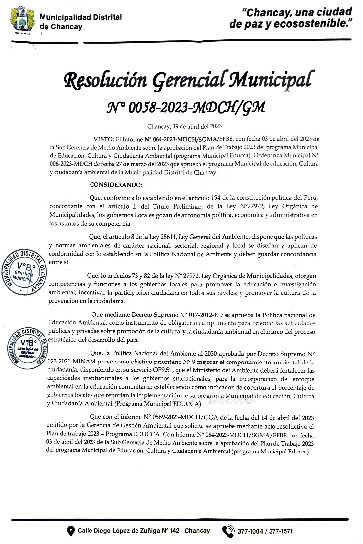 La presente Resolución de Alcaldía/ Resolución de Gerencia Municipal aprueba el Plan de Trabajo 2023 del Programa Municipal de Educación, Cultura y Ciudadanía Ambiental de la Municipalidad Distrital de Chancay - Huaral (Lima), con la finalidad de definir las actividades de educación, cultura y ciudadanía ambiental que se desarrollarán en la localidad durante el presente año.
