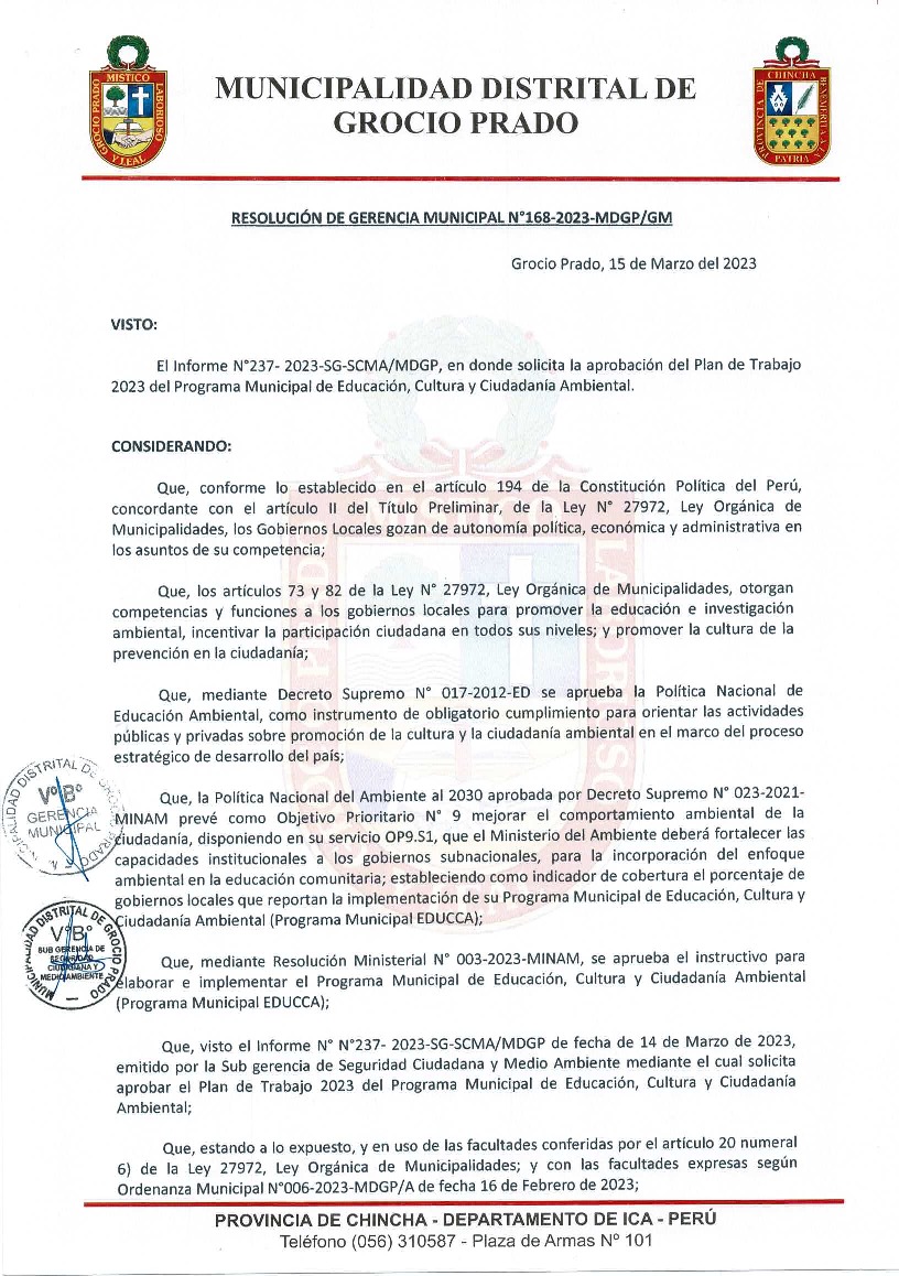La presente Resolución de Gerencia Municipal aprueba el Plan de Trabajo 2023 del Programa Municipal de Educación, Cultura y Ciudadanía Ambiental de la Municipalidad Distrital de Grocio Prado- Chincha (Ica), con la finalidad de definir las actividades de educación, cultura y ciudadanía ambiental que se desarrollarán en la localidad durante el presente año.