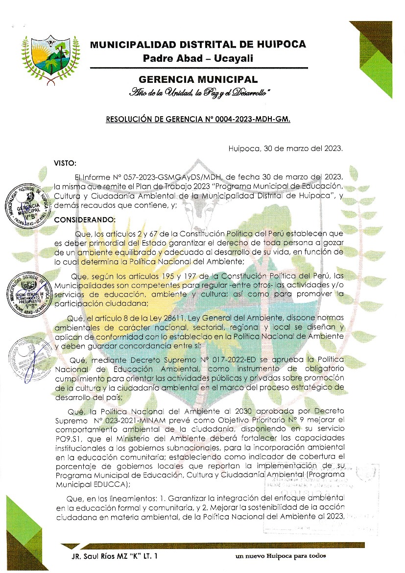 La presente Resolución de Gerencia Municipal aprueba el Plan de Trabajo 2023 del Programa Municipal de Educación, Cultura y Ciudadanía Ambiental de la Municipalidad Distrital de Huipoca, provincia de Padre Abad, región Ucayali, con la finalidad de definir las actividades de educación, cultura y ciudadanía ambiental que se desarrollarán en la localidad durante el presente año.