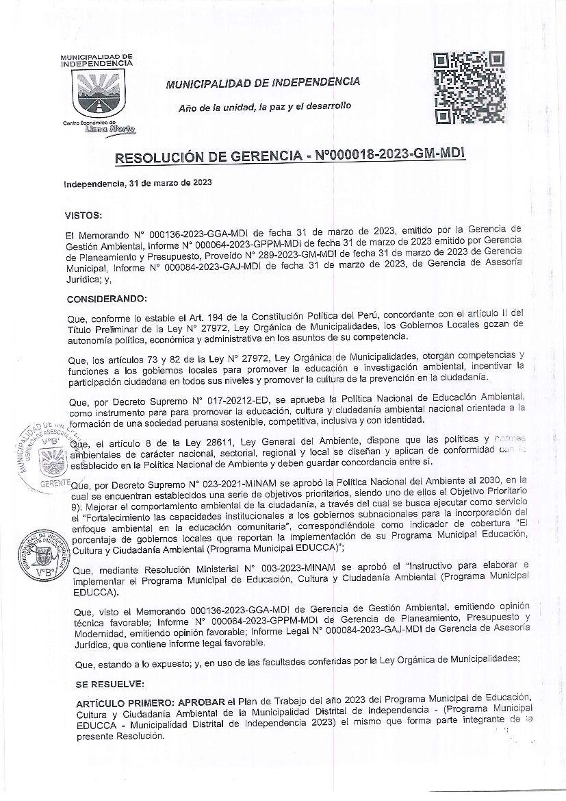 La presente Resolución de Alcaldía/ Resolución de Gerencia Municipal aprueba el Plan de Trabajo 2023 del Programa Municipal de Educación, Cultura y Ciudadanía Ambiental de la Municipalidad Distrital de Independencia (Lima Metropolitana), con la finalidad de definir las actividades de educación, cultura y ciudadanía ambiental que se desarrollarán en la localidad durante el presente año.