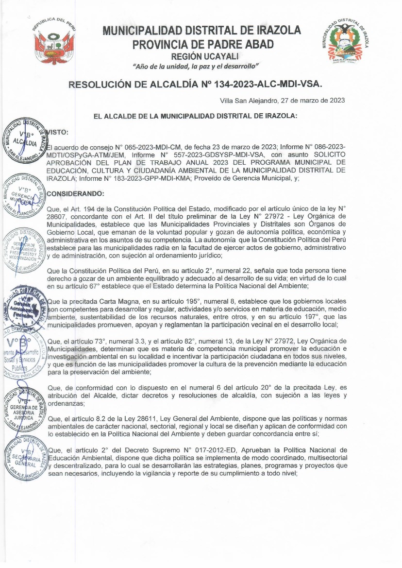 La presente Resolución de Alcaldía aprueba el Plan de Trabajo 2023 del Programa Municipal de Educación, Cultura y Ciudadanía Ambiental de la Municipalidad Distrital de Irazola, provincia de Padre Abad, región Ucayali, con la finalidad de definir las actividades de educación, cultura y ciudadanía ambiental que se desarrollarán en la localidad durante el presente año.