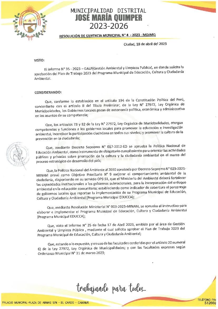 La presente Resolución de Gerencia Municipal aprueba el Plan de Trabajo 2023 del Programa Municipal de Educación, Cultura y Ciudadanía Ambiental de la Municipalidad Distrital de José María Quimper - Camaná (Arequipa), con la finalidad de definir las actividades de educación, cultura y ciudadanía ambiental que se desarrollarán en la localidad durante el presente año.