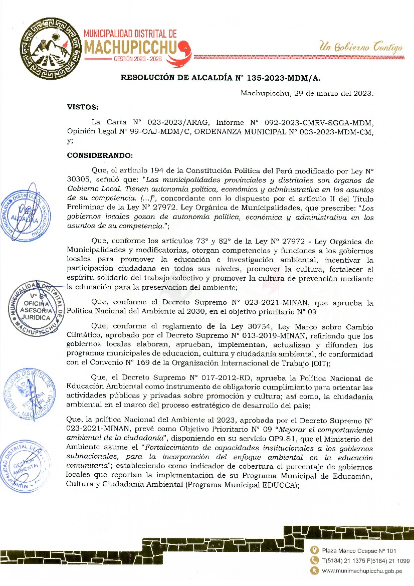 La presente Resolución aprueba el Plan de Trabajo 2023 del Programa Municipal de Educación, Cultura y Ciudadanía Ambiental de la Municipalidad Distrital de Machupicchu, Urubamba (Cusco), con la finalidad de definir las actividades de educación, cultura y ciudadanía ambiental que se desarrollarán en la localidad durante el presente año.