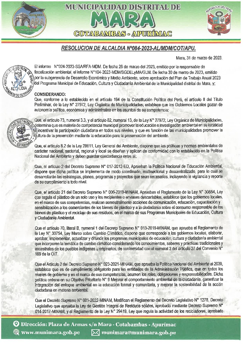 La presente Resolución de Alcaldía aprueba el Plan de Trabajo 2023 del Programa Municipal de Educación, Cultura y Ciudadanía Ambiental de la Municipalidad Distrital de Mara, provincia de Cotabambas, región Apurímac, con la finalidad de definir las actividades de educación, cultura y ciudadanía ambiental que se desarrollarán en la localidad durante el presente año.
