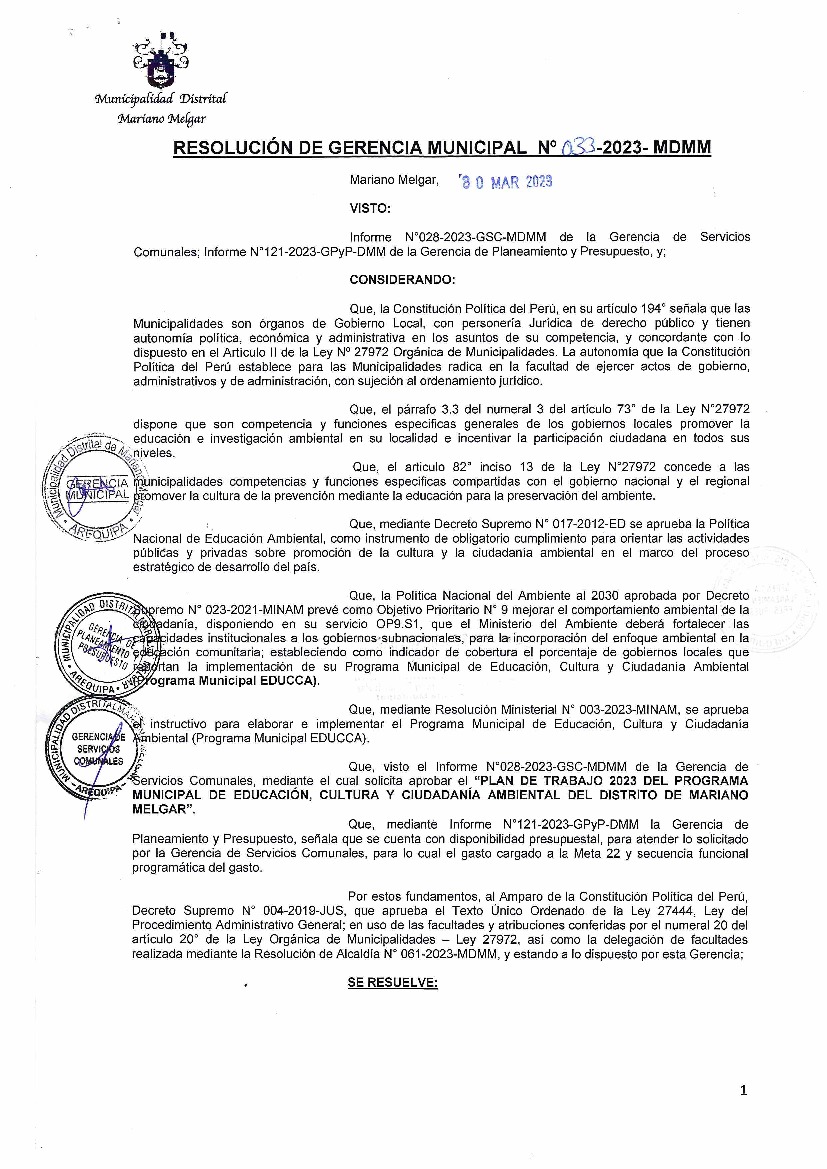 La presente Resolución de Gerencia Municipal aprueba el Plan de Trabajo 2023 del Programa Municipal de Educación, Cultura y Ciudadanía Ambiental de la Municipalidad Distrital de Mariano Melgar - Arequipa (Arequipa), con la finalidad de definir las actividades de educación, cultura y ciudadanía ambiental que se desarrollarán en la localidad durante el presente año.