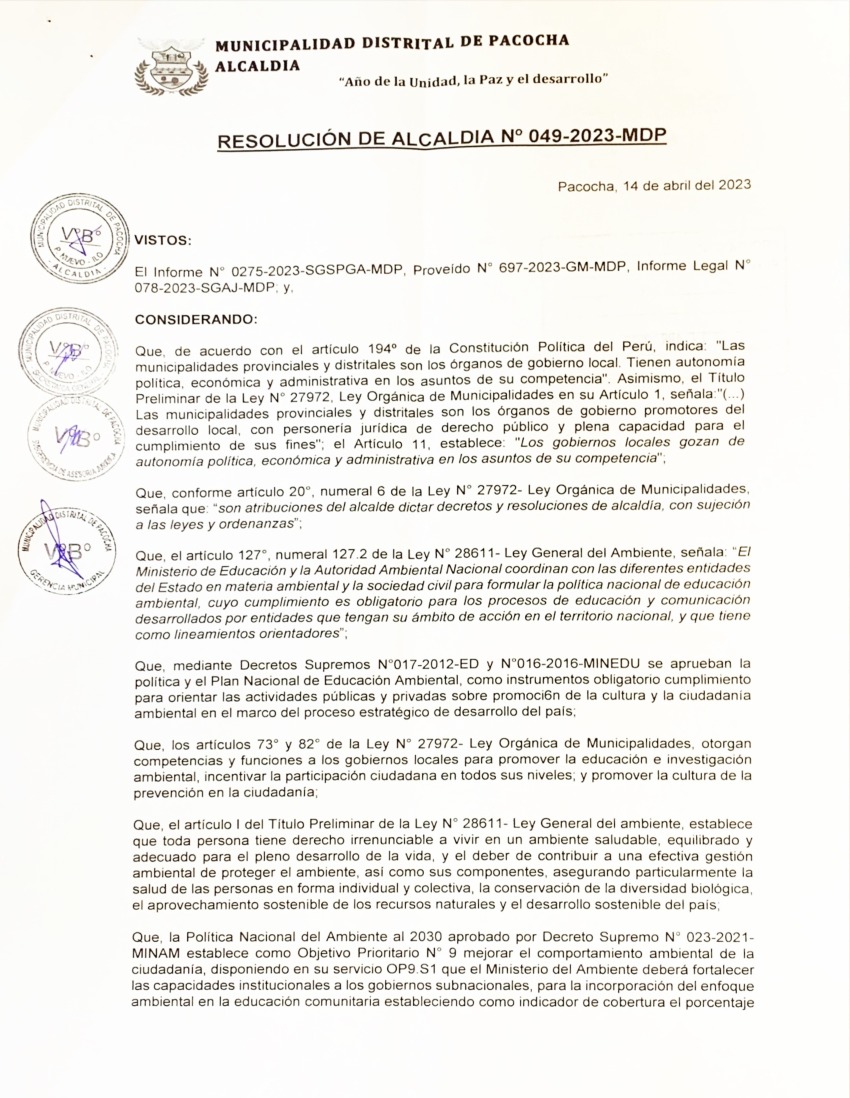 La presente Resolución de Alcaldía/ Resolución de Gerencia Municipal aprueba el Plan de Trabajo 2023 del Programa Municipal de Educación, Cultura y Ciudadanía Ambiental de la Municipalidad Distrital de Pacocha - Ilo (Moquegua), con la finalidad de definir las actividades de educación, cultura y ciudadanía ambiental que se desarrollarán en la localidad durante el presente año.