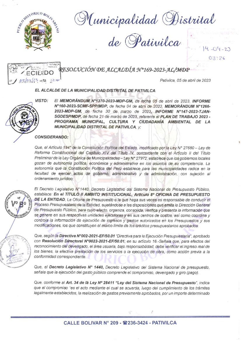 La presente Resolución de Alcaldía/ Resolución de Gerencia Municipal aprueba el Plan de Trabajo 2023 del Programa Municipal de Educación, Cultura y Ciudadanía Ambiental de la Municipalidad Distrital de Pativilca - Barranca (Lima), con la finalidad de definir las actividades de educación, cultura y ciudadanía ambiental que se desarrollarán en la localidad durante el presente año.