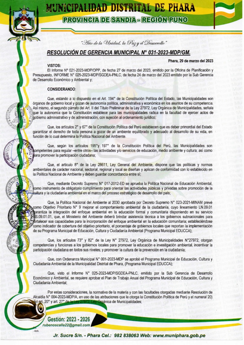La presente Resolución aprueba el Plan de Trabajo 2023 del Programa Municipal de Educación, Cultura y Ciudadanía Ambiental de la Municipalidad Distrital de Phara, con la finalidad de definir las actividades de educación, cultura y ciudadanía ambiental que se desarrollarán en la localidad durante el presente año.
