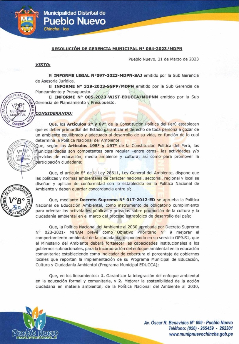 La presente Resolución de Gerencia Municipal aprueba el Plan de Trabajo 2023 del Programa Municipal de Educación, Cultura y Ciudadanía Ambiental de la Municipalidad Distrital de Pueblo Nuevo - Chincha (Ica), con la finalidad de definir las actividades de educación, cultura y ciudadanía ambiental que se desarrollarán en la localidad durante el presente año.