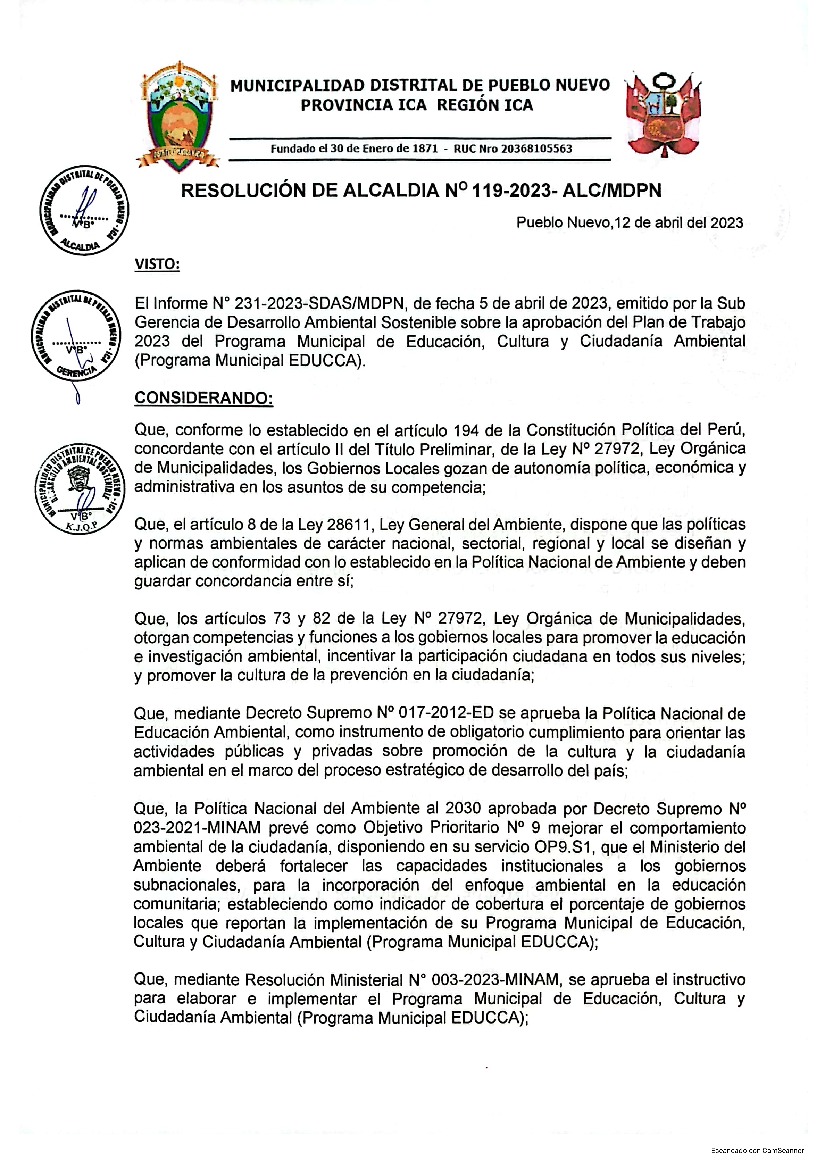 La presente Resolución de Alcaldía aprueba el Plan de Trabajo 2023 del Programa Municipal de Educación, Cultura y Ciudadanía Ambiental de la Municipalidad Distrital de Pueblo Nuevo - Ica (Ica), con la finalidad de definir las actividades de educación, cultura y ciudadanía ambiental que se desarrollarán en la localidad durante el presente año.