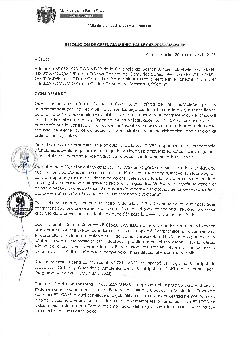 La presente Resolución de Gerencia Municipal aprueba el Plan de Trabajo 2023 del Programa Municipal de Educación, Cultura y Ciudadanía Ambiental de la Municipalidad Distrital de Puente Piedra (Lima Metropolitana), con la finalidad de definir las actividades de educación, cultura y ciudadanía ambiental que se desarrollarán en la localidad durante el presente año.