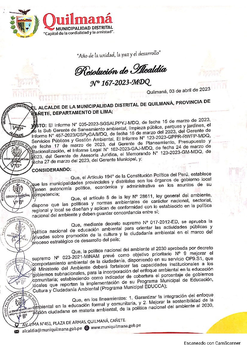 La presente Resolución de Alcaldía, aprueba el Plan de Trabajo 2023 del Programa Municipal de Educación, Cultura y Ciudadanía Ambiental de la Municipalidad Distrital de Quilmaná - Cañete (Lima), con la finalidad de definir las actividades de educación, cultura y ciudadanía ambiental que se desarrollarán en la localidad durante el presente año.