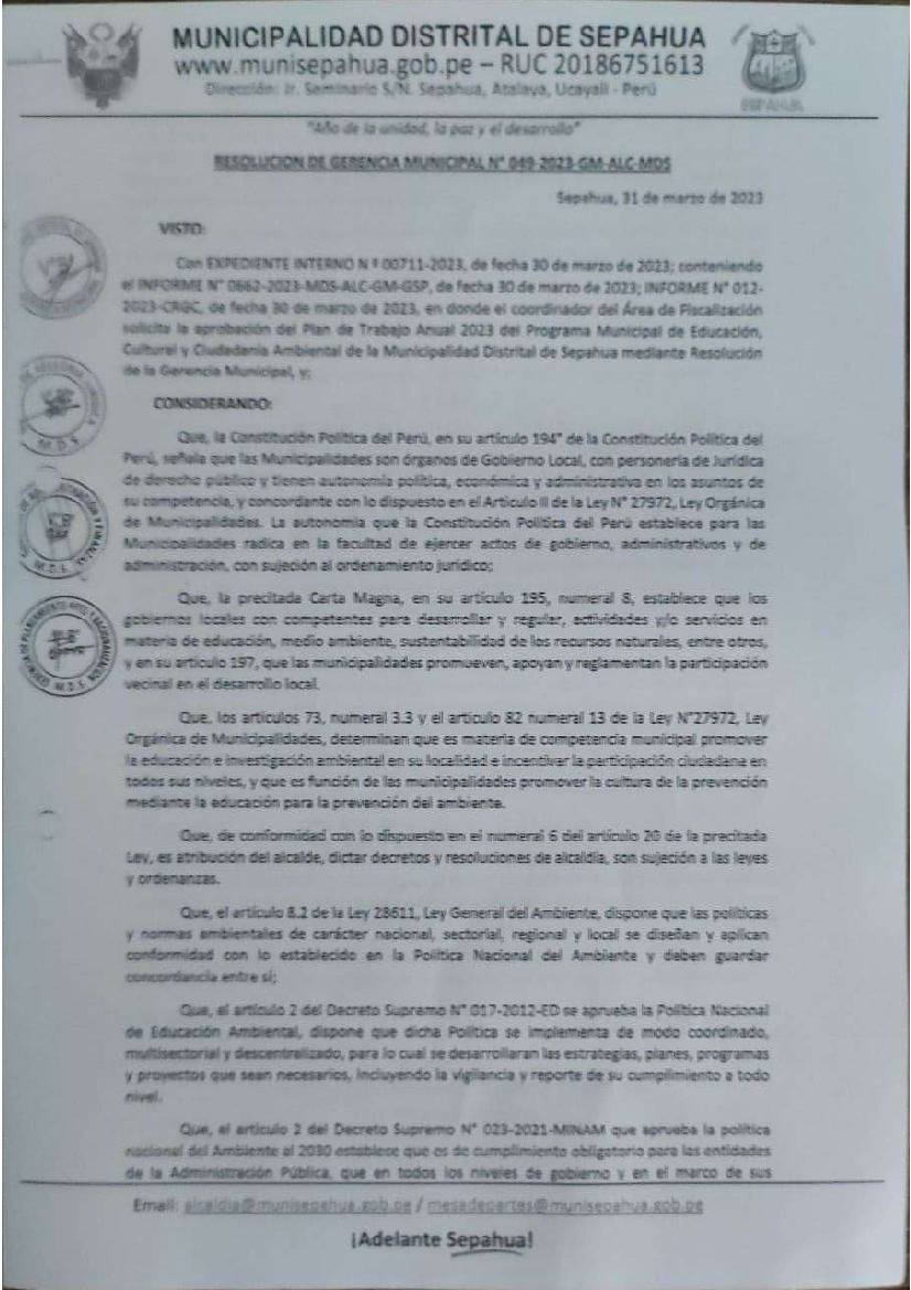 La presente Resolución de Gerencia Municipal aprueba el Plan de Trabajo 2023 del Programa Municipal de Educación, Cultura y Ciudadanía Ambiental de la Municipalidad Distrital de Sepahua, provincia de Atalaya, región Ucayali, con la finalidad de definir las actividades de educación, cultura y ciudadanía ambiental que se desarrollarán en la localidad durante el presente año.