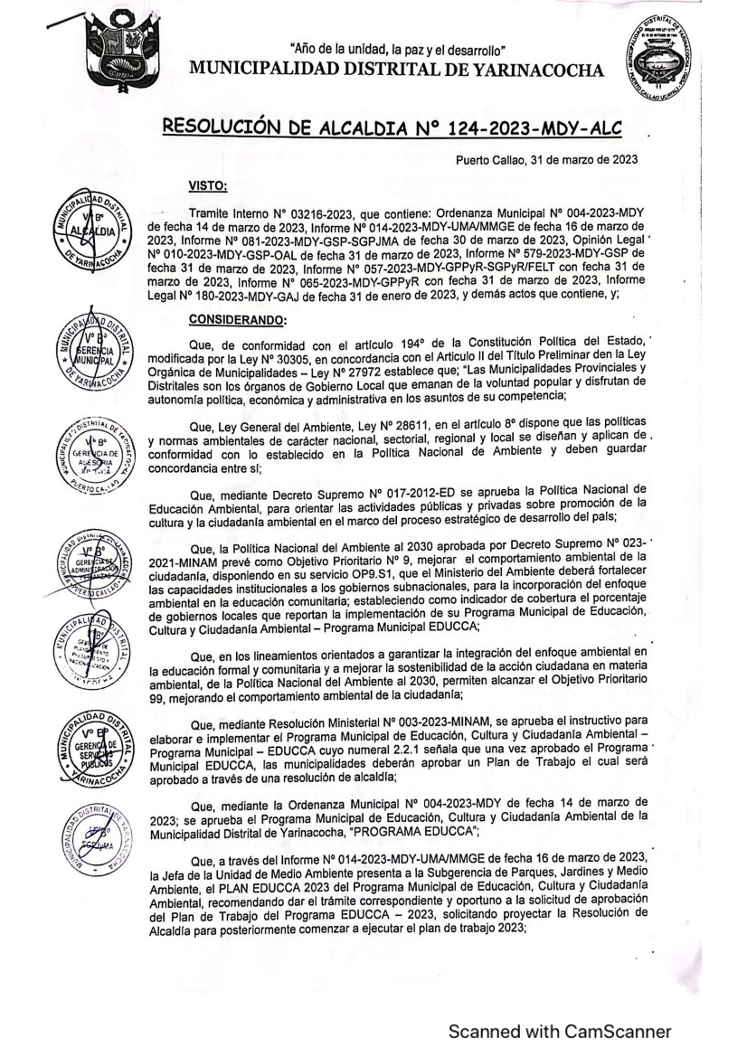 La presente Resolución de Alcaldía aprueba el Plan de Trabajo 2023 del Programa Municipal de Educación, Cultura y Ciudadanía Ambiental de la Municipalidad Distrital de Yarinacocha, provincia de Coronel Portillo, región Ucayali, con la finalidad de definir las actividades de educación, cultura y ciudadanía ambiental que se desarrollarán en la localidad durante el presente año.