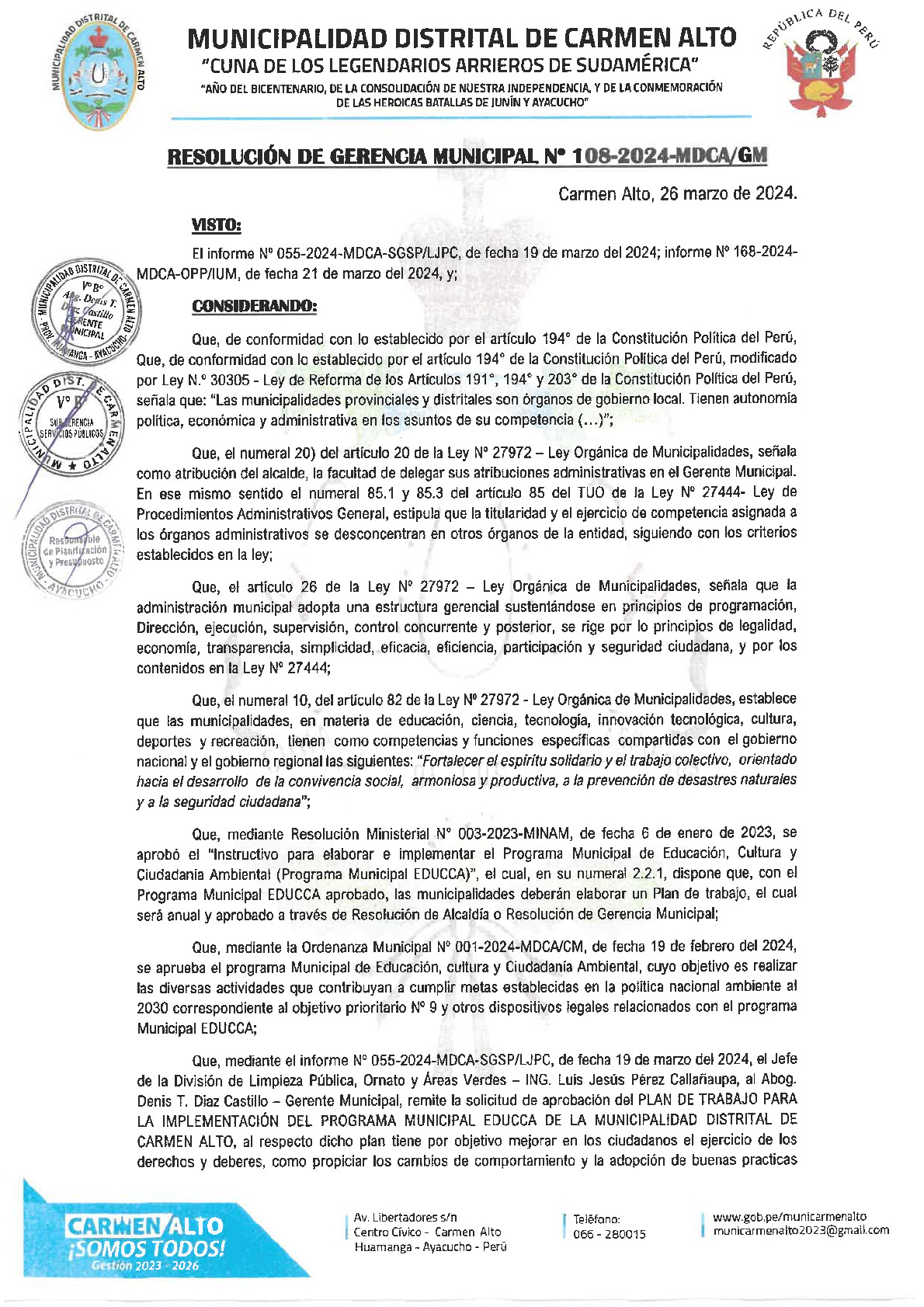 La presente Resolución de Gerencia Municipal aprueba el Plan de Trabajo 2024 del Programa Municipal de Educación, Cultura y Ciudadanía Ambiental de la Municipalidad Distrital de Carmen Alto - Huamanga (Ayacucho), con la finalidad de definir las actividades de educación, cultura y ciudadanía ambiental que se