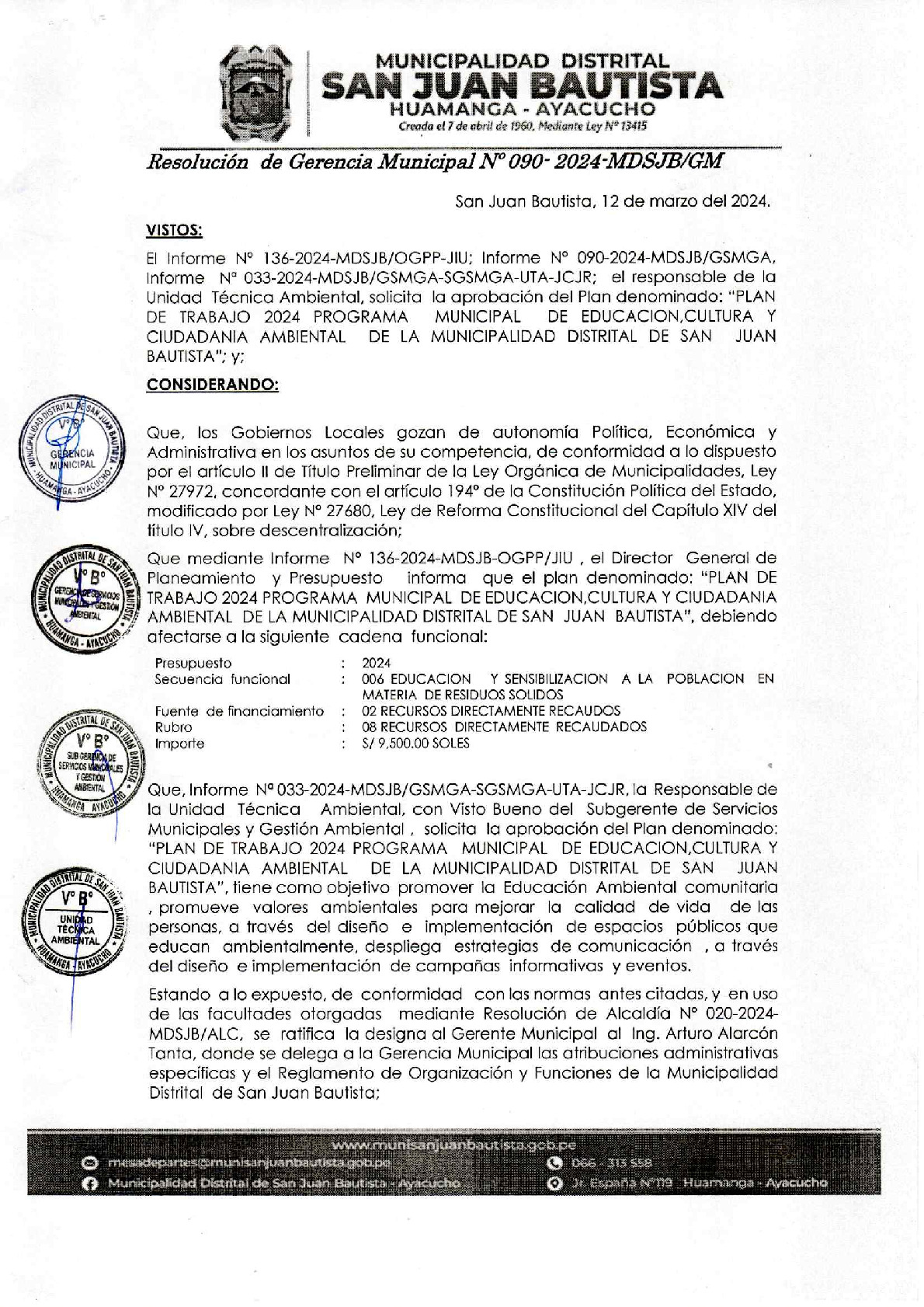La presente Resolución de Gerencia Municipal aprueba el Plan de Trabajo 2024 del Programa Municipal de Educación, Cultura y Ciudadanía Ambiental de la Municipalidad Distrital de San Juan Bautista-Huamanga (Ayacucho), con la finalidad de definir las actividades de educación, cultura y ciudadanía ambiental que se