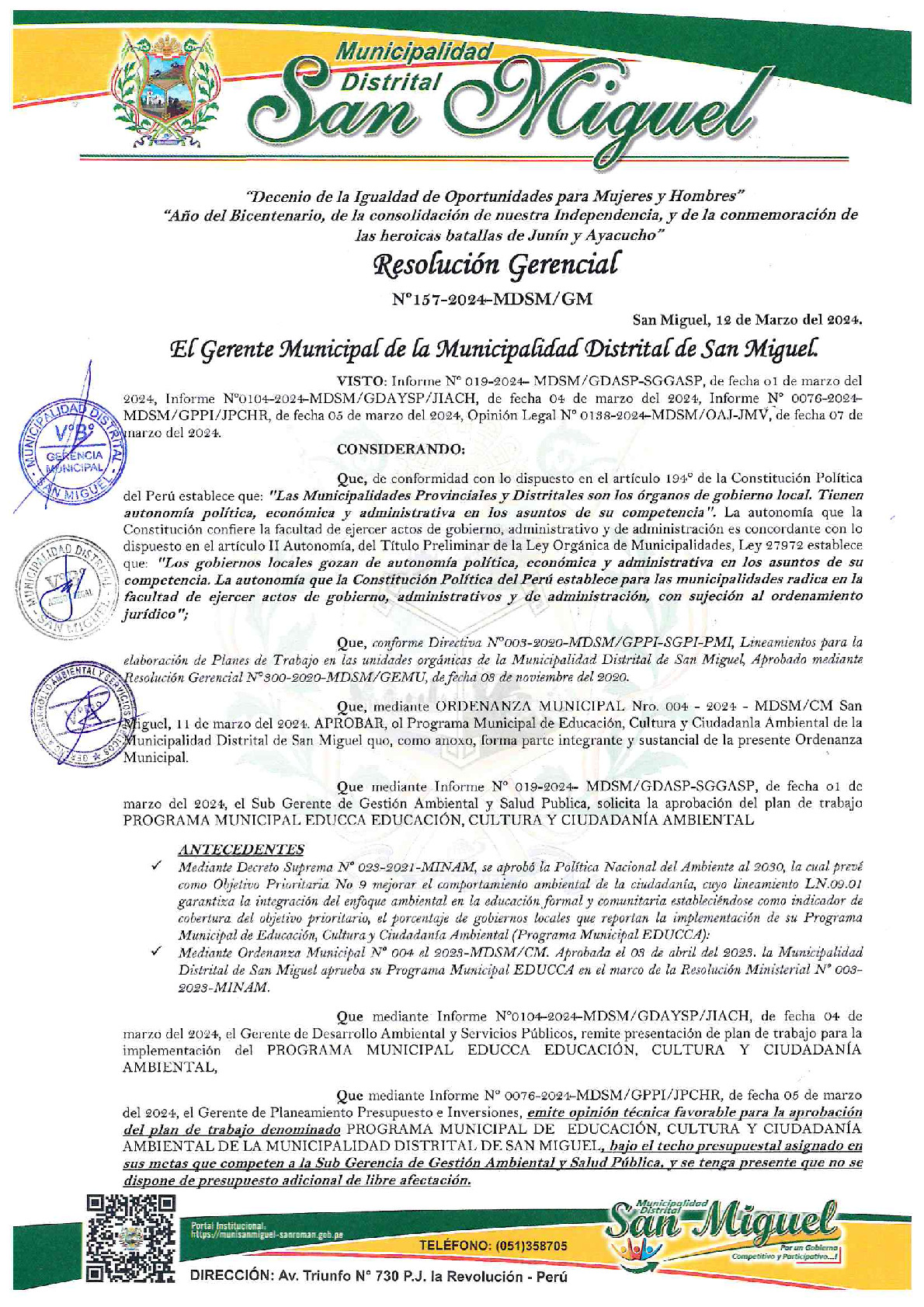 La presente Resolución de Gerencia Municipal aprueba el Plan de Trabajo 2024 del Programa Municipal de Educación, Cultura y Ciudadanía Ambiental de la Municipalidad Distrital de San Miguel- San Román (Puno), con la finalidad de definir las actividades de educación, cultura y ciudadanía ambiental que se
