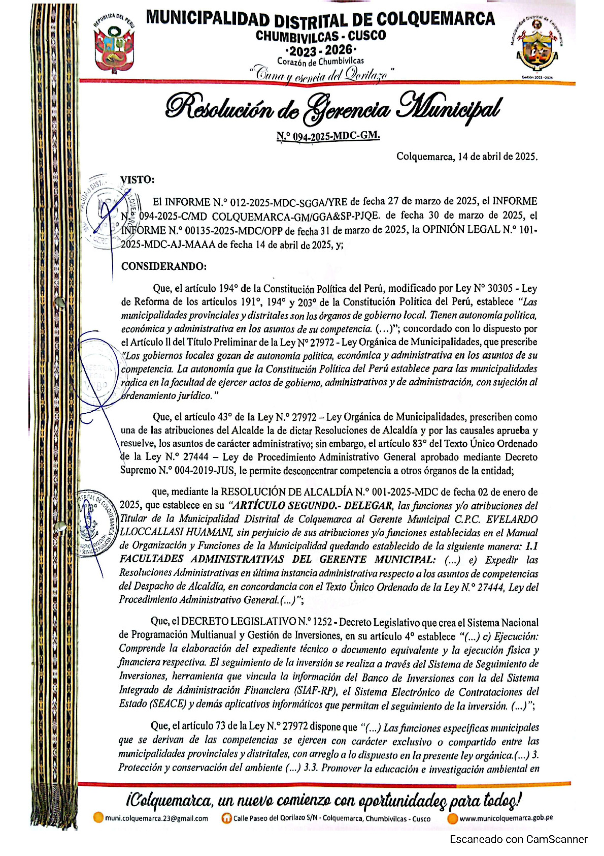 La presente Resolución de Gerencia Municipal aprueba el Plan de Trabajo 2025 del Programa Municipal de Educación, Cultura y Ciudadanía Ambiental de la Municipalidad Distrital de Colquemarca (Cusco), con la finalidad de definir las actividades de educación, cultura y ciudadanía ambiental que se desarrollaran en la localidad durante el presente año.