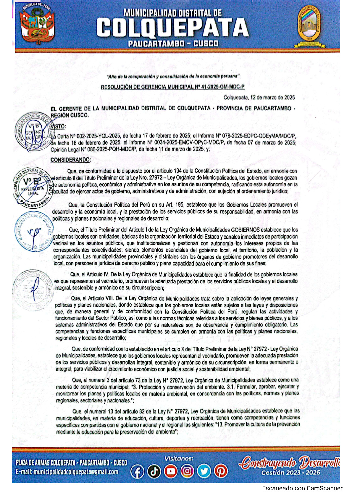 La presente Resolución de Gerencia Municipal aprueba el Plan de Trabajo 2025 del Programa Municipal de Educación, Cultura y Ciudadanía Ambiental de la Municipalidad Distrital de Colquepata (Cusco), con la finalidad de definir las actividades de educación, cultura y ciudadanía ambiental que se desarrollaran en la localidad durante el presente año.