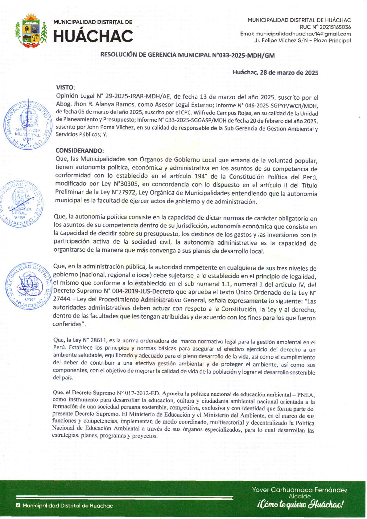 La presente Resolución de Gerencia Municipal aprueba el Plan de Trabajo 2025 del Programa Municipal de Educación, Cultura y Ciudadanía Ambiental de la Municipalidad Distrital de Huáchac (Junín), con la finalidad de definir las actividades de educación, cultura y ciudadanía ambiental que se desarrollaran en la localidad durante el presente año.