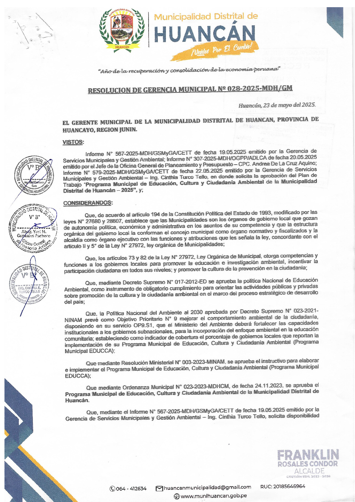 La presente Resolución de Gerencia Municipal aprueba el Plan de Trabajo 2025 del Programa Municipal de Educación, Cultura y Ciudadanía Ambiental de la Municipalidad Distrital de Huancán (Junín), con la finalidad de definir las actividades de educación, cultura y ciudadanía ambiental que se desarrollaran en la localidad durante el presente año.