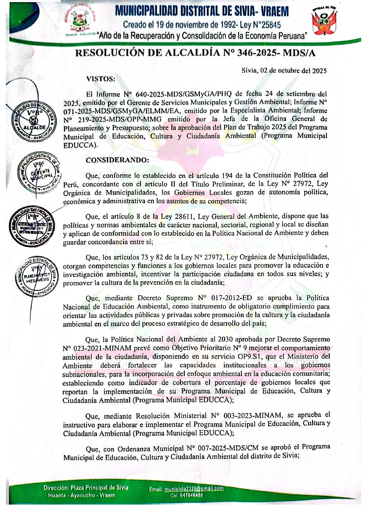 La presente Resolución de Alcaldía aprueba el Plan de Trabajo 2025 del Programa Municipal de Educación, Cultura y Ciudadanía Ambiental de la Municipalidad Distrital de Sivia - Huanta (Ayacucho), con la finalidad de definir las actividades de educación, cultura y ciudadanía ambiental que se desarrollarán en la localidad durante el presente año.