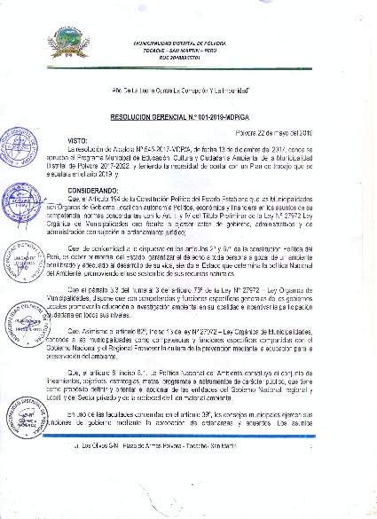 Que en el artículo primero se Aprueba el Plan de Trabajo 2019, del Programa de Educación, Cultura y Ciudadanía Ambiental de la Municipalidad Distrital de Pólvora 2019.